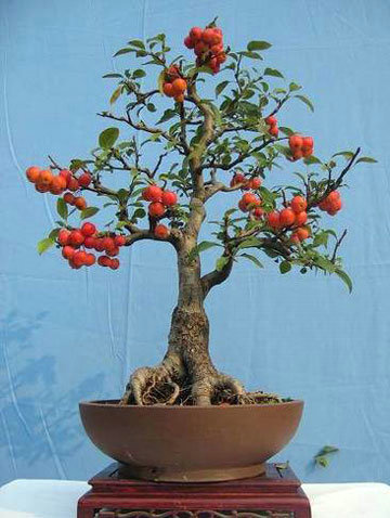(2) 澆水 山楂較耐旱,未結(jié)果的樹對水分要求不嚴(yán)格,但是結(jié)果的盆景則必須保證水分的充足供應(yīng)。盆內(nèi)以保證濕潤為度,不宜積水,秋季要控制澆水量,而冬季則寧干勿濕。